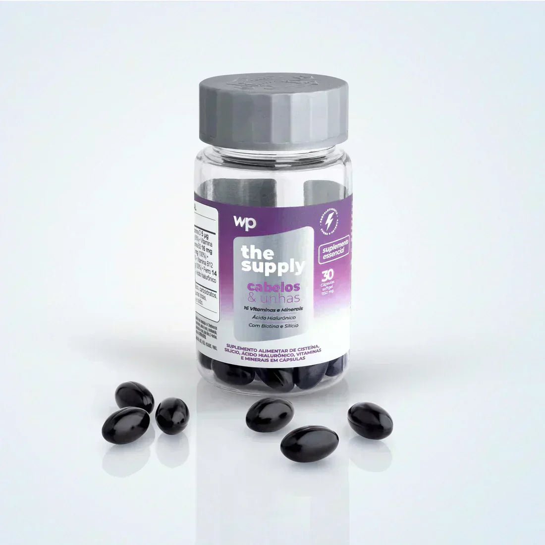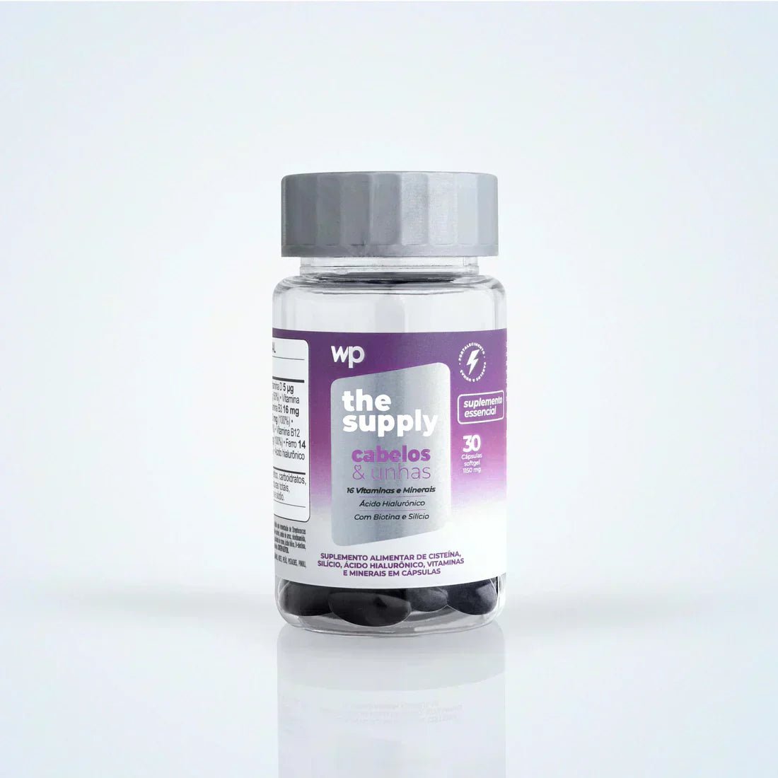 The supply Cabelos&unhas tem cápsulas de rápida absorção (softgel) e blend de 18 vitaminas e minerais para fortalecer cabelos e unhas.